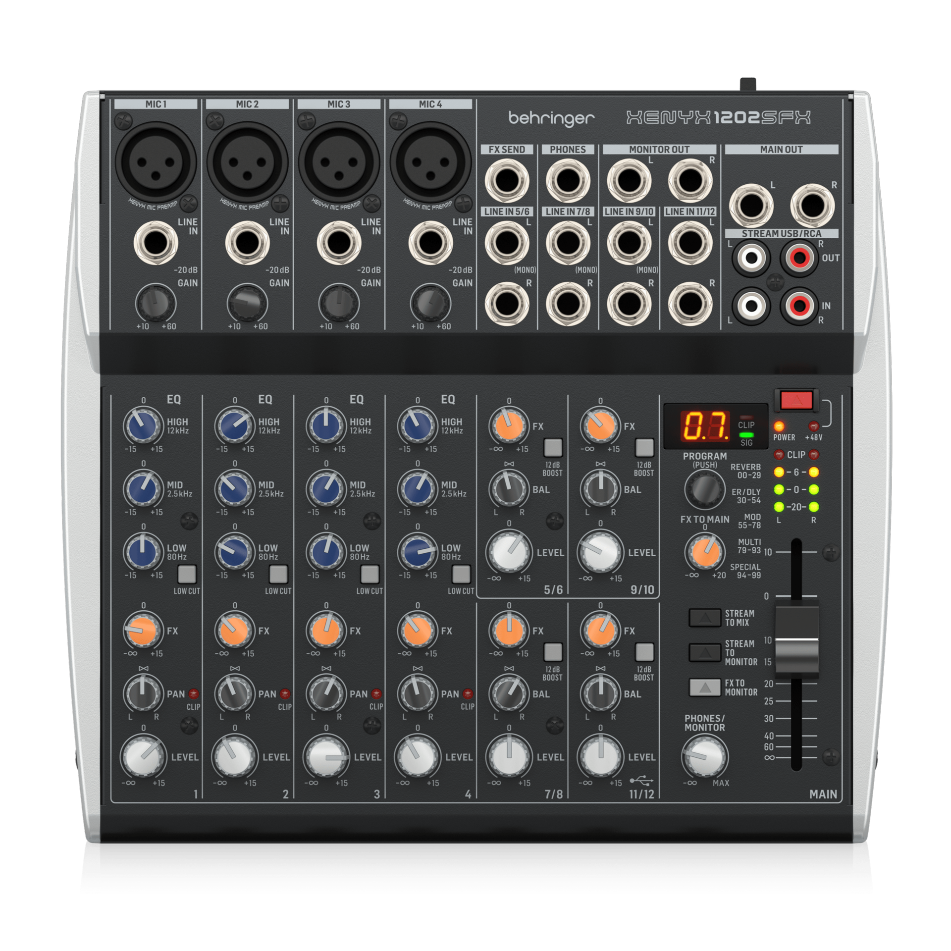 The 1202SFX features level, panorama/balance and effect send controls on all channels and allows for precise sound shaping for any input source. Mono channels have additional Gain controls and 3-band EQ with switchable Low Cut, while stereo line-level channels offer a switchable 12 dB boost.