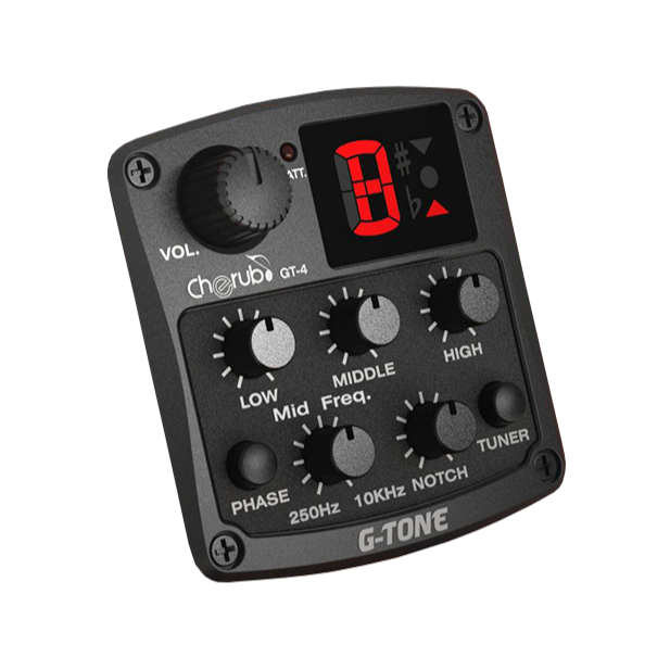GT-4 is a 4 band EQ with Chromatic tuner, feedback-fighting notch and phase effect. The visible portion of GT-4 is only 52mm*54mm*4mm. Low battery message will be displayed when the battery is getting low.