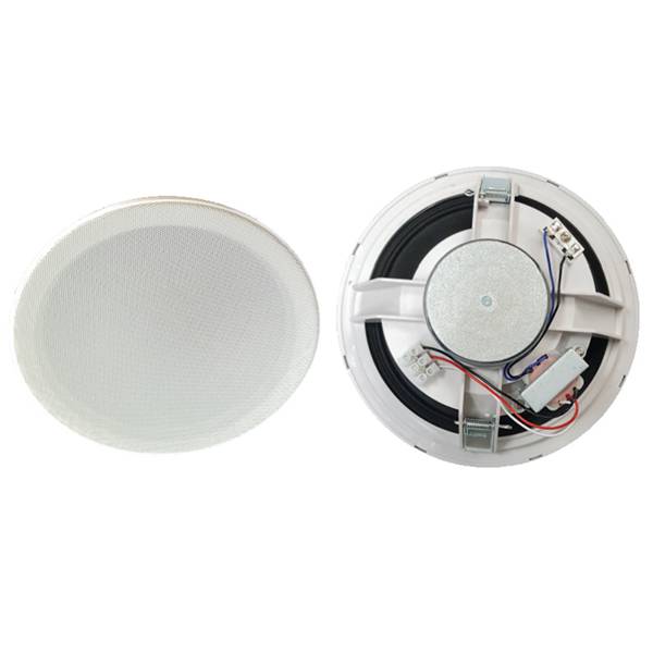 The FILO CAVSC8W 8″ Ceiling Speaker, delivering crisp sound in a sleek design. With a metal grill and dual cone construction, it boasts a wide frequency response, high sensitivity, and multiple power taps for versatile installation options.