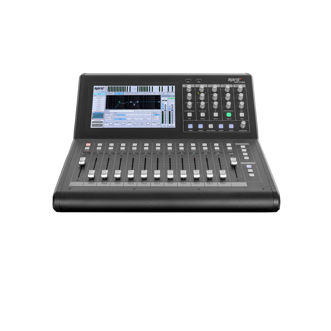 The Hybrid+ DM1606 is a 16-channel digital mixer which has been designed to provide effortless user interface navigation and comprehension, even for live engineers who are not experts with hands-on digital mixer platforms. Specifically, the large 10” touch screen provides clear visibility of information and controls. Through the carefully laid-out onboard controls, quick edits to a live mix (a crucial functionality in the dynamic environment of a live event) are easily achieved through the multi-layer motorised faders and dual-action rotary encoders.
