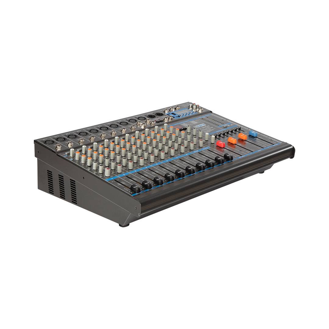 The Hybrid M121200PUX is a 12-channel stereo mixer with 8 × mono mic/line inputs, 2 × stereo line inputs and 2 × 600W loudspeaker outputs. The M121200PUX hosts a number of features, such as a built-in MP3 media player, a digital effects processor and switched phantom power for condenser microphones. This makes it ideal for small productions that require a powered mixer solution, such as those commonly hosted at schools, smaller places of worship and venues with small stages.