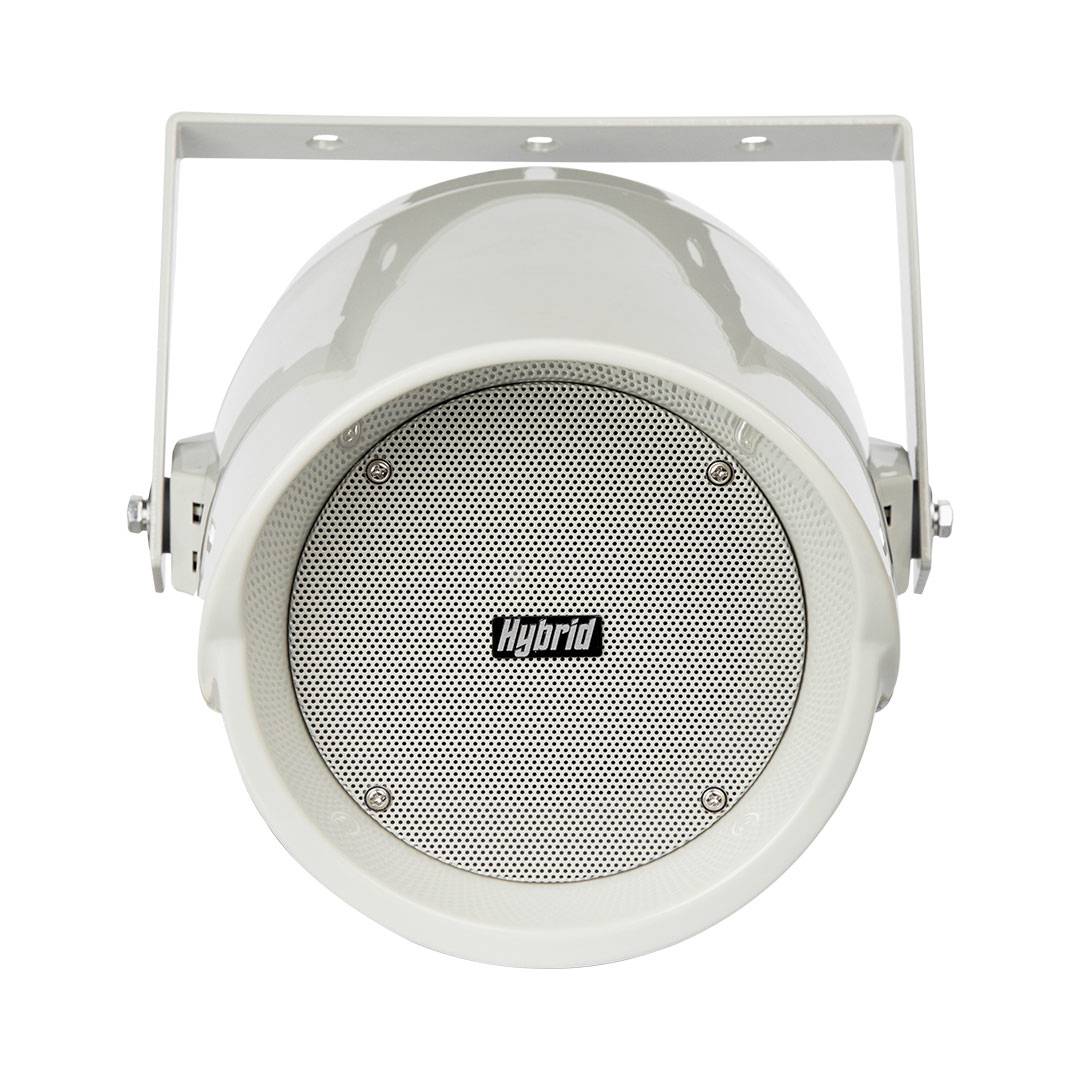 Projection Speaker – 30W/100V. The Hybrid SP5 is a 5″, waterproof (IP65 rated), outdoor projection speaker. Although the SP5 does not reach the high SPL levels inherent in traditional horn speakers, it offers a better bass response making it suitable for speech and background music for venues such as outdoor terraces.