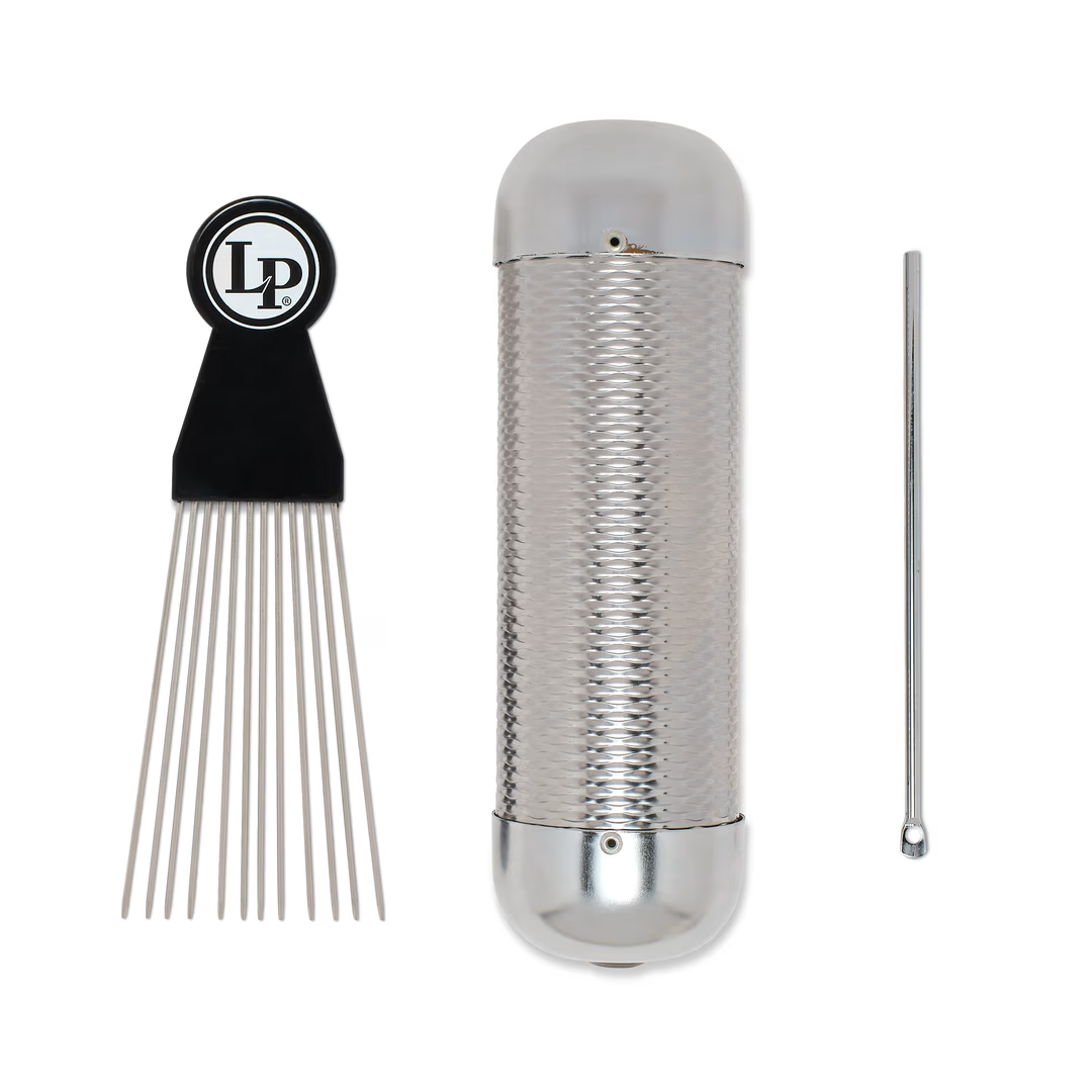 This two-textured guiro is filled with steel shot for raspy sounds.