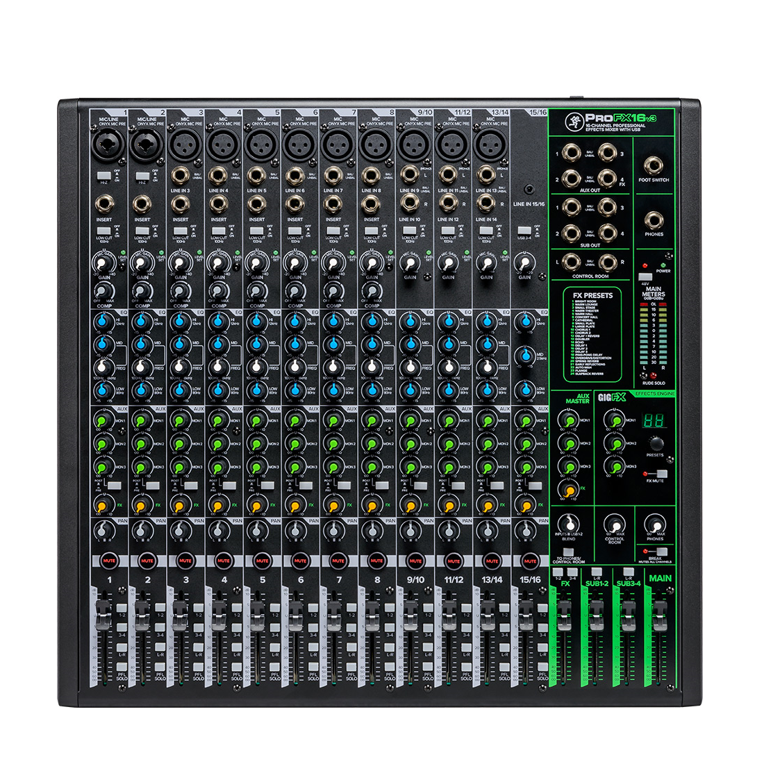 Experience the best-in-class series of professional analog USB mixers with effects. The Mackie ProFX16v3 is a 16-channel mixer that brings next-level performance and versatility to recording studios and venues.