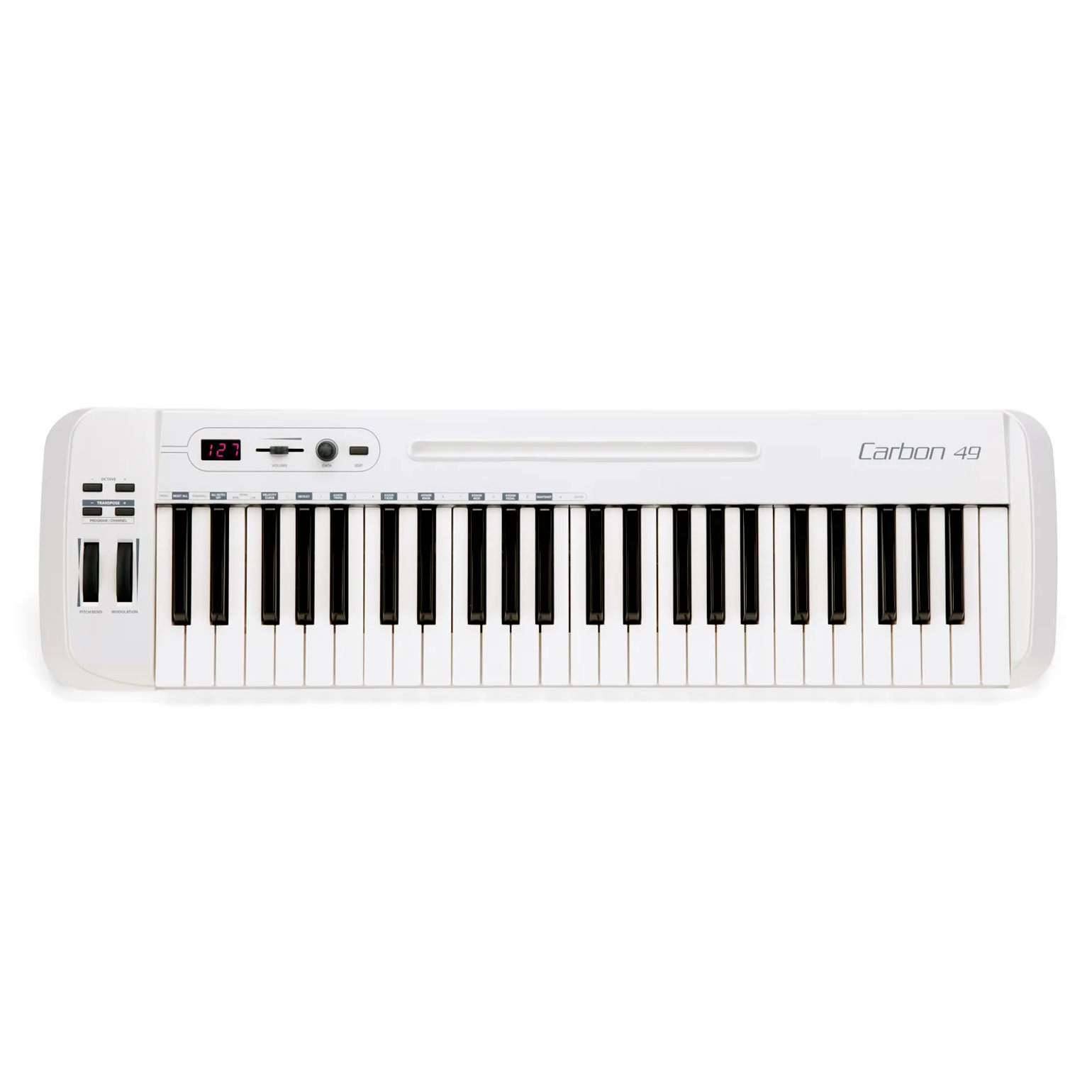 Volume Fader, Data Knob, Edit Button, Octave +/- buttons, Transpose +/- buttons, Pitch Bend Wheel, Modulation Wheel |