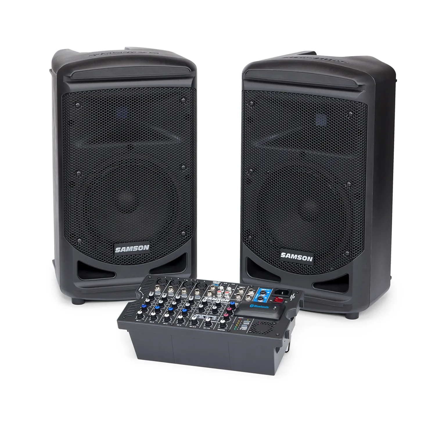 The Samson XP800 is the perfect all-in-one PA system for anyone looking for powerful sound and easy setup, with 800 watts of power, an 8-channel mixer, and a unique speaker locking design for easy portability, all in one lightweight package.