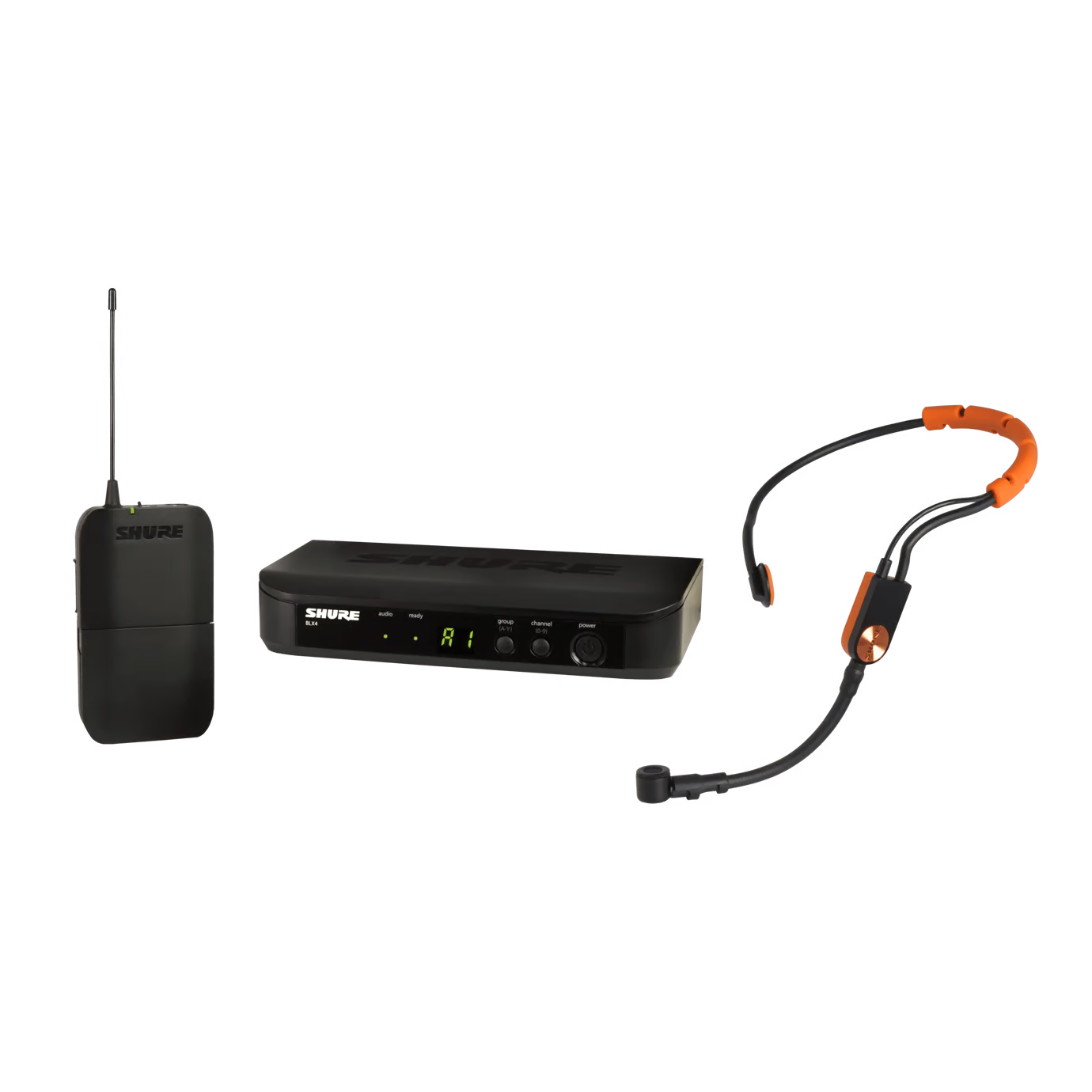 Wireless Fitness Headset System with SM31FH Headset Microphone. The Shure BLX14/SM31 Wireless Fitness Headset System combines professional-quality sound with simple setup and up to 14 hours battery life for legendary audio performance right out of the box. The system includes BLX4 tabletop single-channel receiver, SM31FH headset microphone (w/ moisture-repelling construction) with BLX1 bodypack transmitter, clothing clip, power supply, 2 AA batteries, windscreens, and user guide.