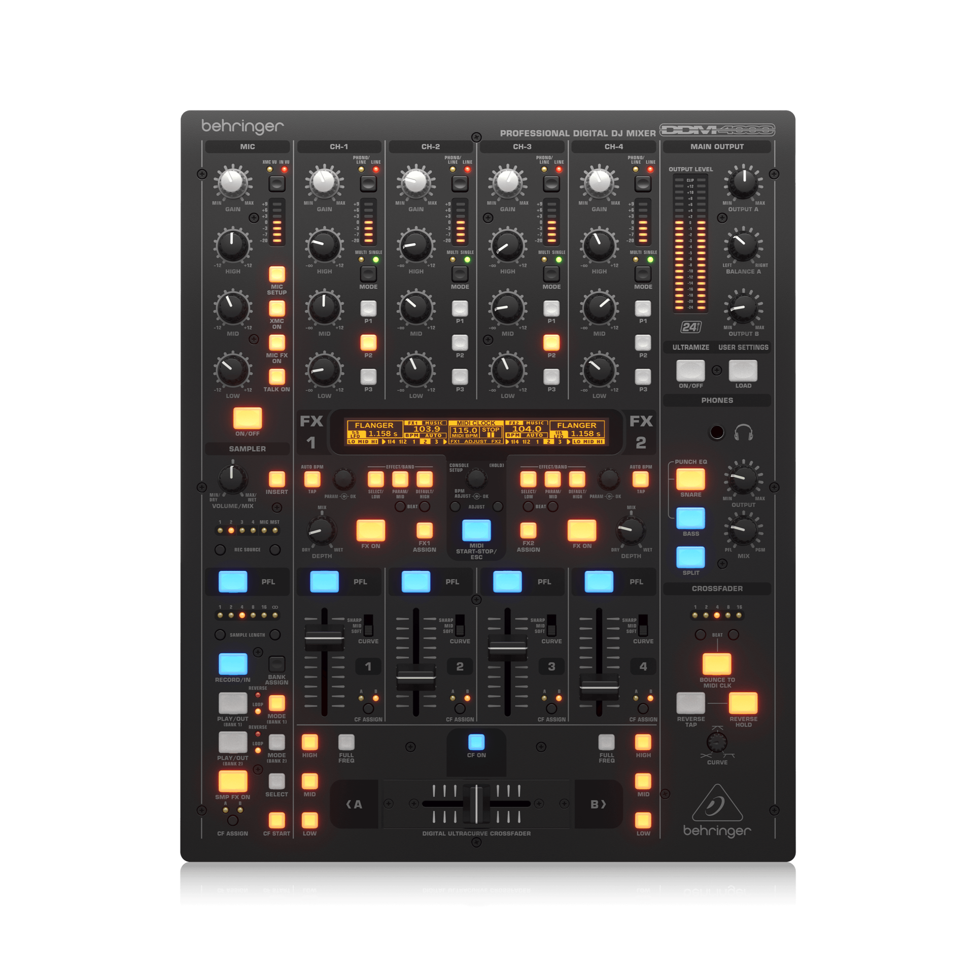 32-bit digital DJ mixer with beat-synchronized sampler, 4 multi-FX sections, 2 BPM counters, digital crossfader and MIDI