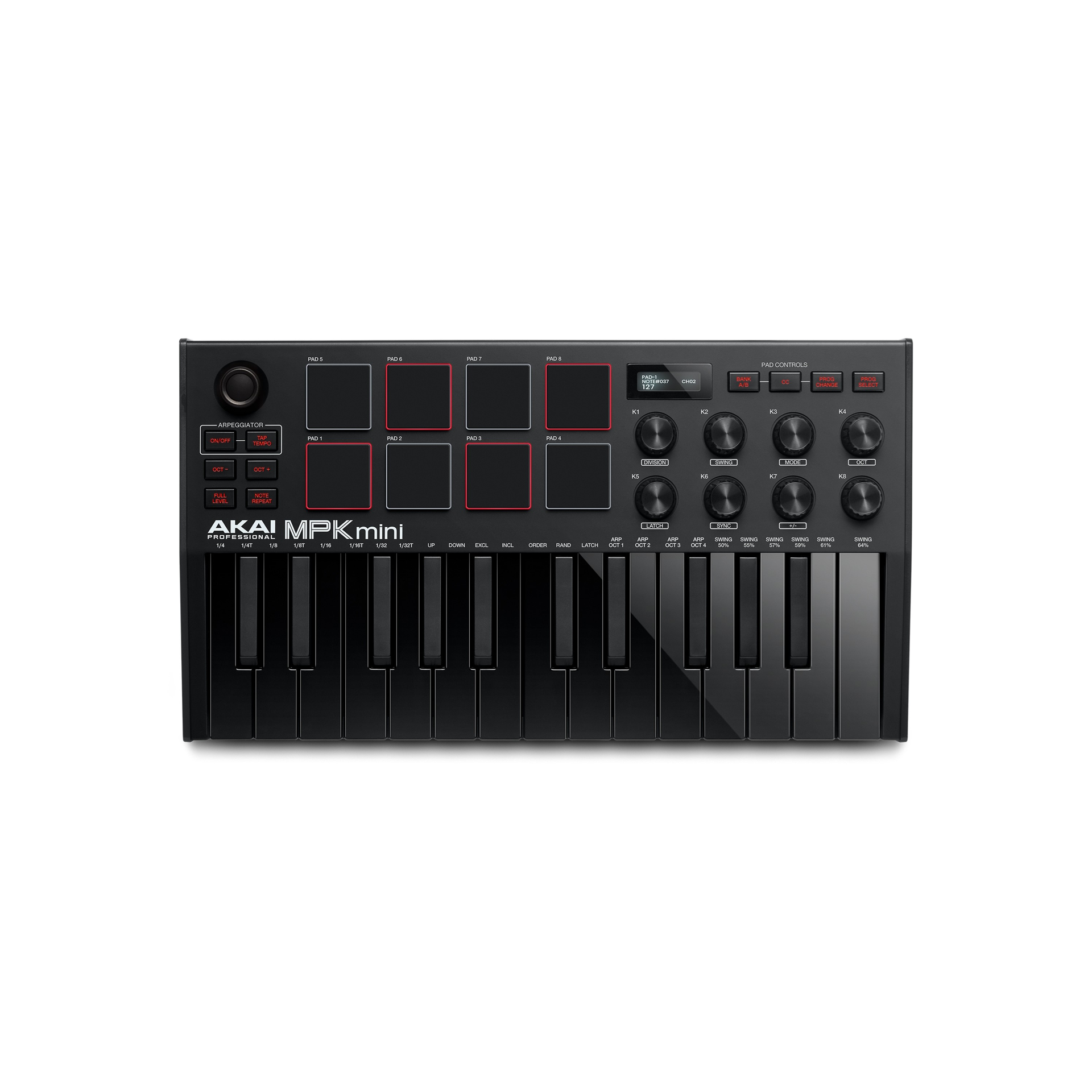 25 Mini Keys Featuring New Keybed Technology | Brilliant OLED Display for Immediate Parameter Feedback | 8 MPC Performance Pads w/ Note Repeat and Full Level in two banks (16 total) | 8 Endless Knobs to tweak your software parameters | 4-way Joystick for Pitch & Modulation Control | Class-Compliant USB Connectivity | Built-in Arpeggiator | Sustain Pedal Input Jack | Superior, Sturdy Design & Build