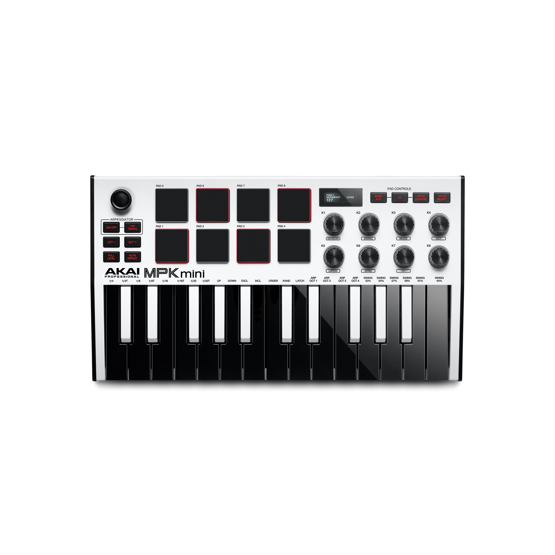 25 Mini Keys Featuring New Keybed Technology | Brilliant OLED Display for Immediate Parameter Feedback | 8 MPC Performance Pads w/ Note Repeat and Full Level in two banks (16 total) | 8 Endless Knobs to tweak your software parameters | 4-way Joystick for Pitch & Modulation Control | Class-Compliant USB Connectivity | Built-in Arpeggiator | Sustain Pedal Input Jack | Superior, Sturdy Design & Build