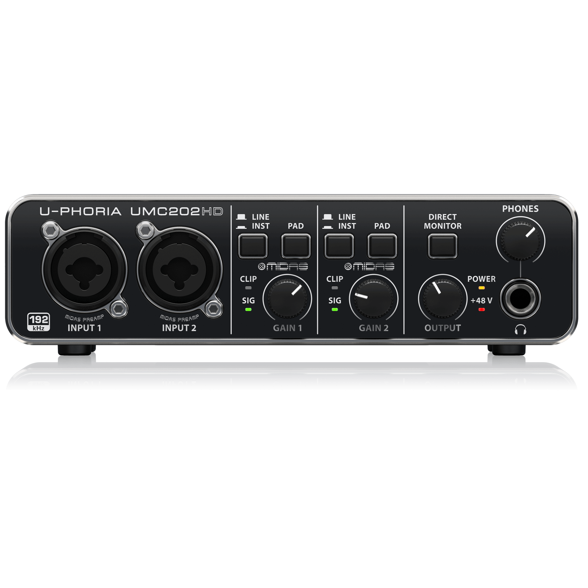 This blazingly fast USB 2.0 studio in a box will have you recording your next masterpiece in minutes with all the connectivity for microphones, guitars, bass and keyboards. Record the perfect vocal right to your computer-based DAW thanks to the 2 astonishingly pure, worldclass Midas-designed mic preamps, which include +48 Volt phantom power for condenser microphones, all going through studio-grade 24-Bit/192 kHz converters for the best possible sound quality. Whether you’re a singer-songwriter, producer on the go, or just need a rock-solid interface for running backing tracks at a gig, the ultra-dependable U-PHORIA UMC202HD will help you shine in the digital domain.
