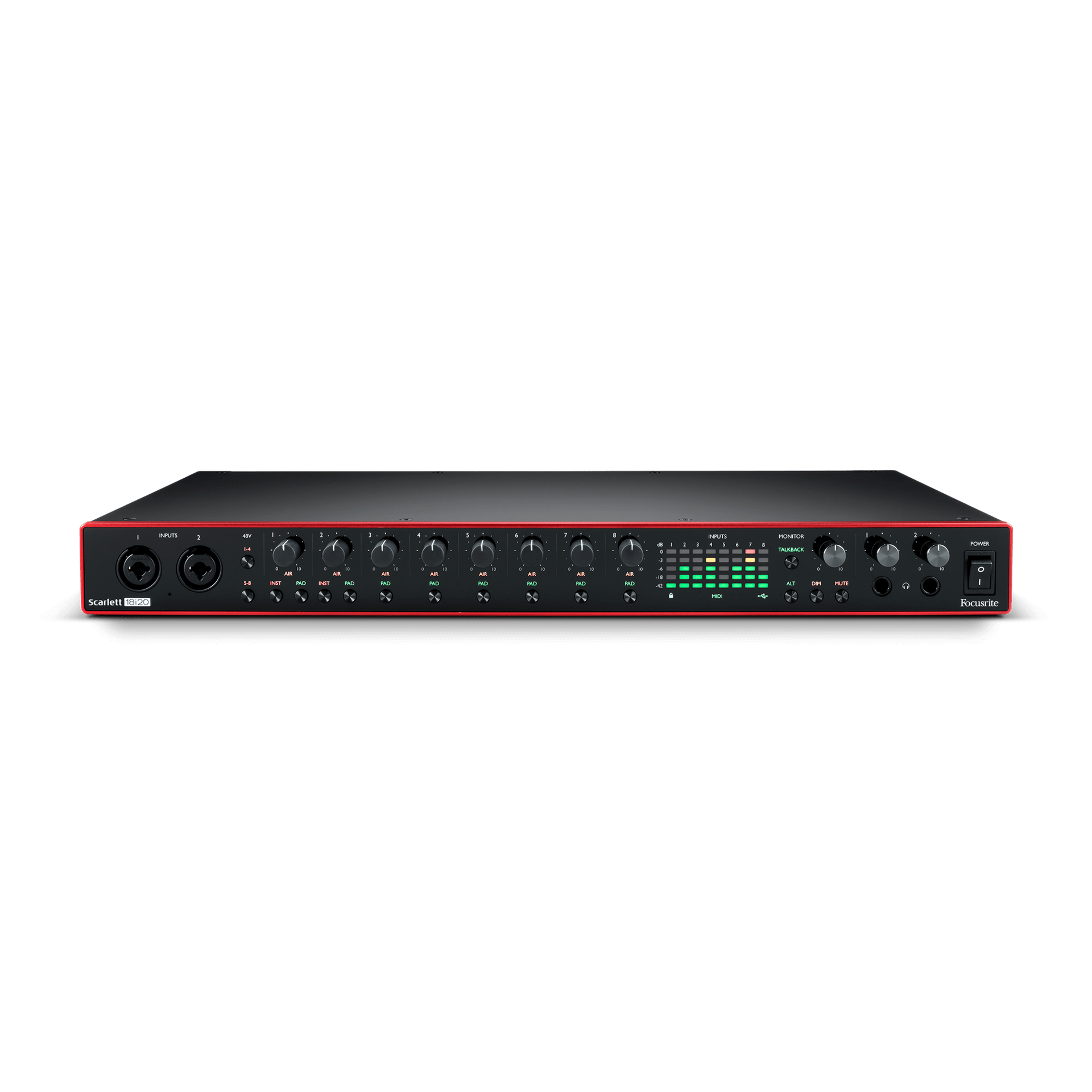 - Eight inputs and ten outputs; eight 3rd Generation mic pres, two Hi-Z instrument inputs, and ten balanced outputs plus ADAT input and output for up to eight more channels each way.