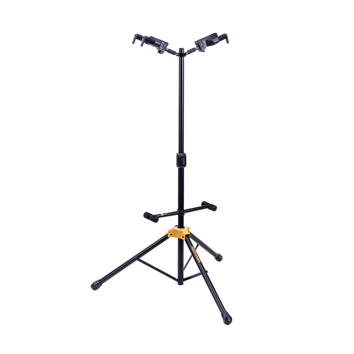 The HERCULES Double Guitar Stand GS422B PLUS accommodates two instruments and features the foldable Auto Grip System (AGS) yokes, Instant Height Adjustment Clutch, Specially Formulated Foam (SFF) padding contacts and the adjustable back rests.