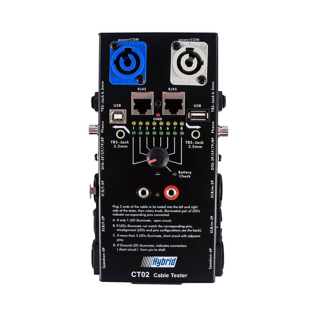 The Hybrid CT02 is a valuable tool for all applications where cables are being used for the first time, be it a permanent or temporary installation. Most system failures occur due to faulty cables so it is good practice to test all cables before using them. Hybrid offers 3 cable testing units with different testing ports to suit your needs.