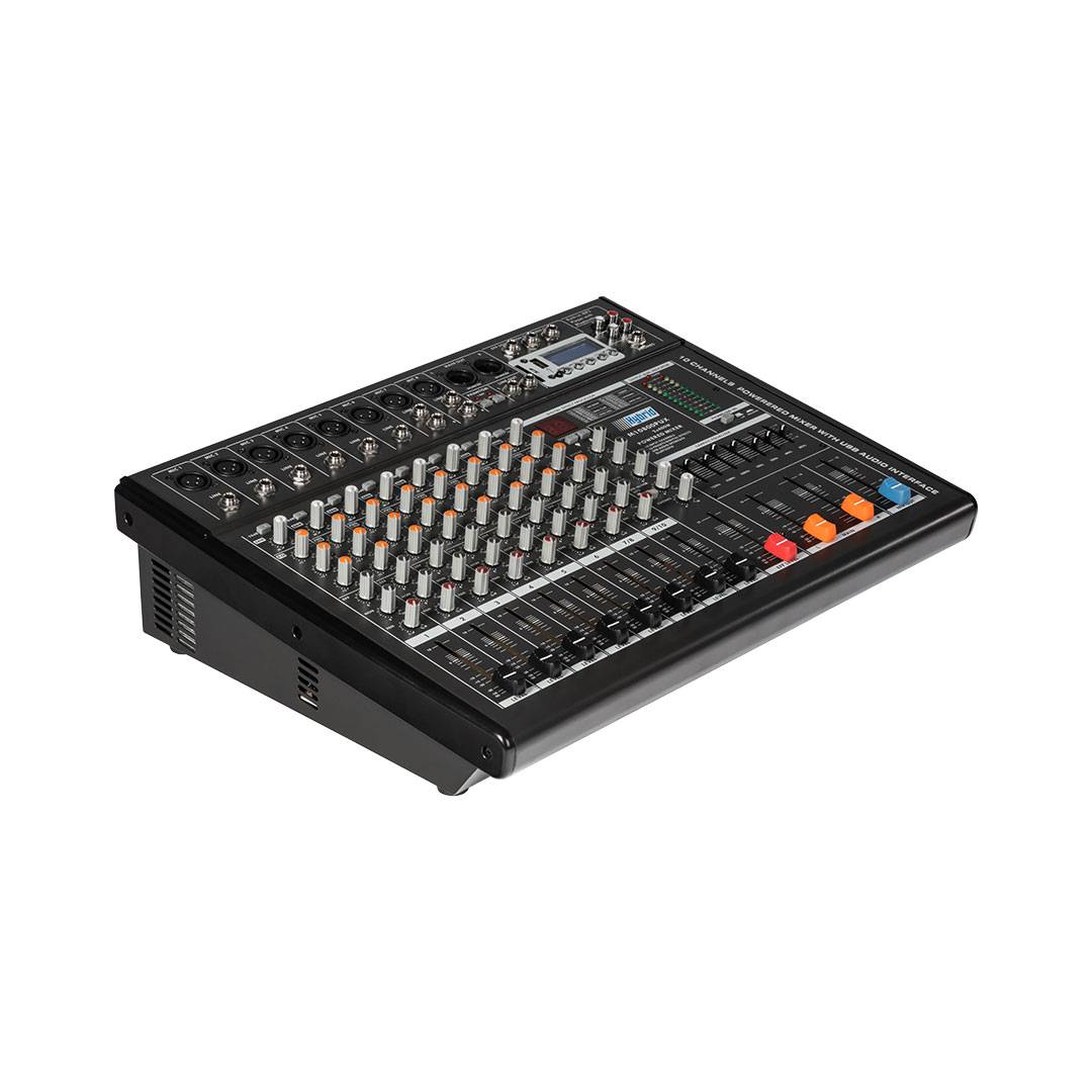 The Hybrid M10800PUX is a 10-channel stereo mixer with 6 × mono mic/line inputs, 2 × stereo line inputs and 2 × 400W loudspeaker outputs. The M10800PUX hosts a number of features, such as a built-in MP3 media player, a digital effects processor and switched phantom power for condenser microphones. This makes it ideal for small productions that require a powered mixer solution, such as those commonly hosted at schools, smaller places of worship and venues with small stages.
