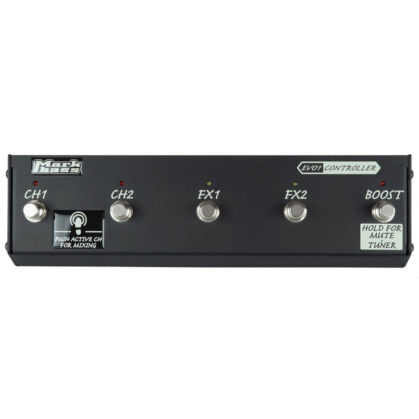 The optional MB EVO 1 CONTROLLER allows to switch between CH1 / CH2 and MIX the two channels, turn on/off the FX1, FX2 and BOOST, plus accessing the TUNER with MUTE function pressing and holding the boost switch. The Mark Bass EVO 1 can be controlled also via programmable MIDI pedalboard.