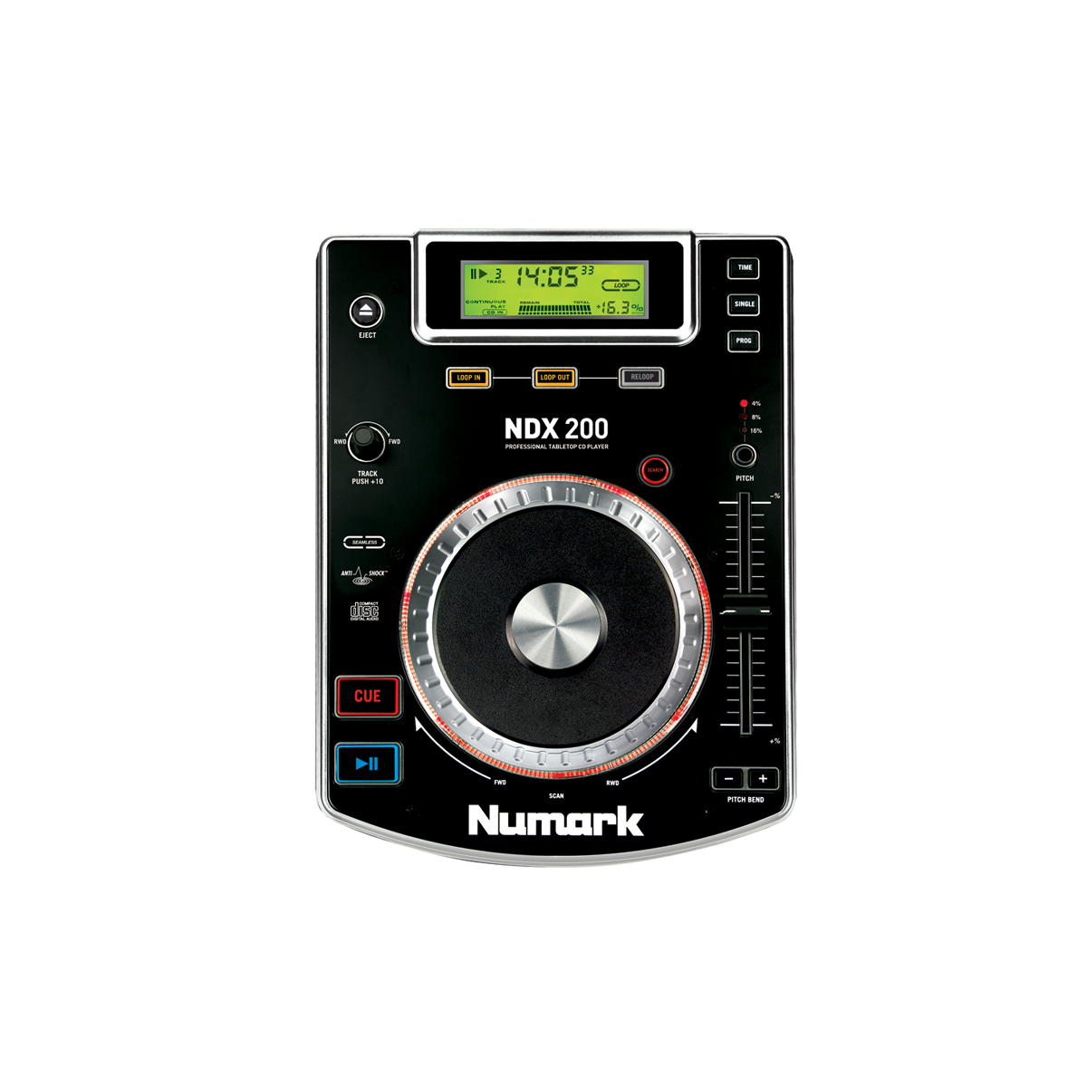 NDX200 is a CD player with a heavy, rugged build and a large jog wheel for comfortable performance. Numark’s Anti-Shock™ buffered skip-protection technology keeps music playing, even when vibrations might cause other players to skip.