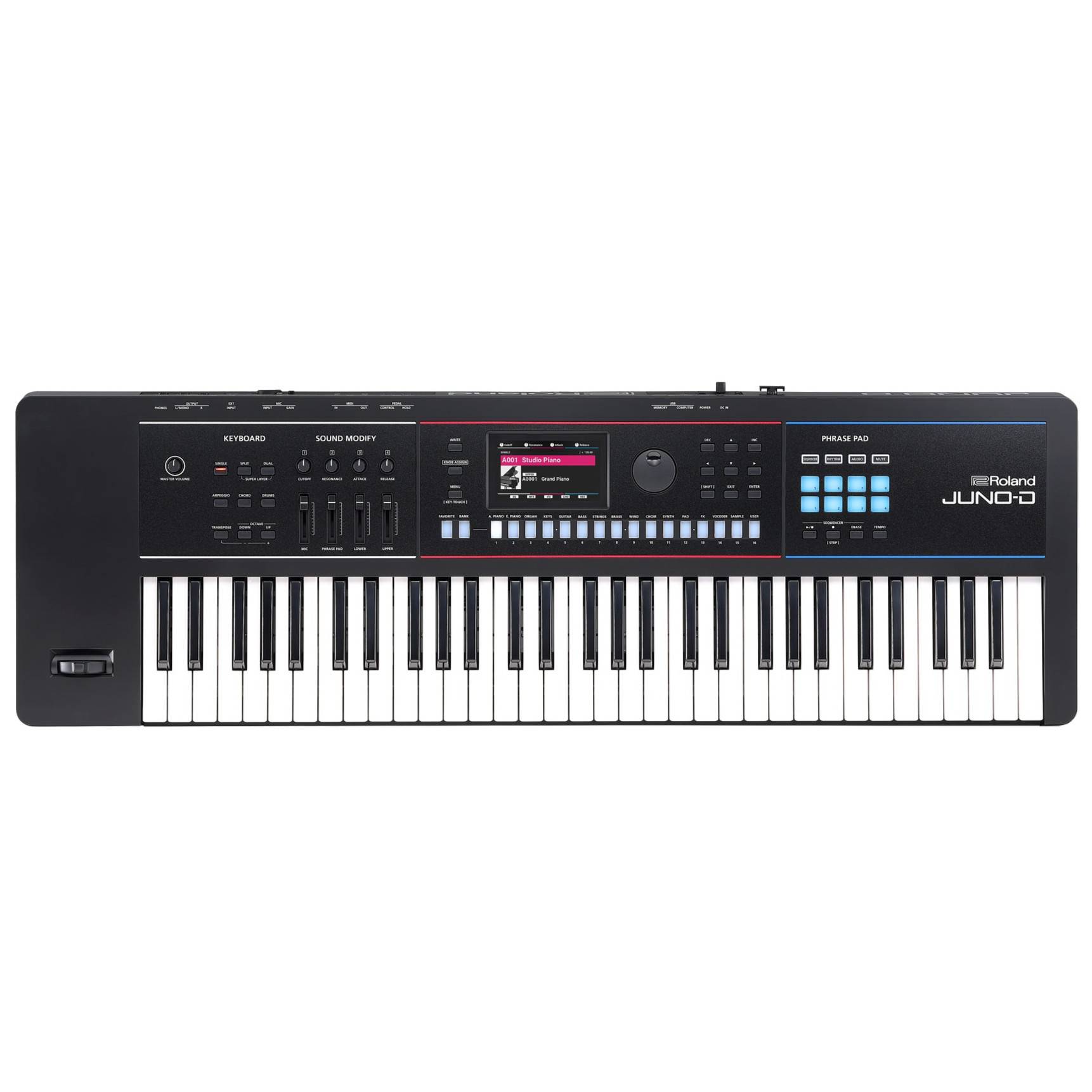 JUNO-D is the perfect synth for gigging musicians and budding creators. This light and portable keyboard features a pro-grade Roland sound engine and an intuitive panel layout for easy operation. Play in a band or craft new songs with a massive sound library, an eight-track sequencer, and versatile connections for your gear. Perform on the move with support for USB-C mobile battery power. And stay inspired with new sounds on Roland Cloud.