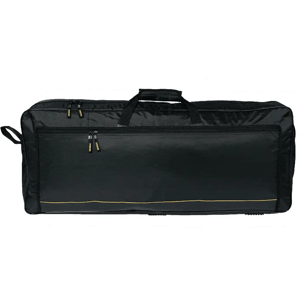 Soft gig bag for keyboard with maximum dimensions 1220 x 420 x 160 mm from Deluxe series, made from waterproof and durable black TorTex nylon durable material with 20 mm foam padding that provides great protection against mechanical damage and external influences. Bag is equipped with two interior 50 mm safety straps for keyboard protection during opening the bag, heavy duty double main zipper (10 mm wide) and PVC reinforced sides, as well as bottom that is reinforced with PVC pyramids. It also features a front pocket for accessories with 8 mm wide zipper and carrying handle. Black colour.